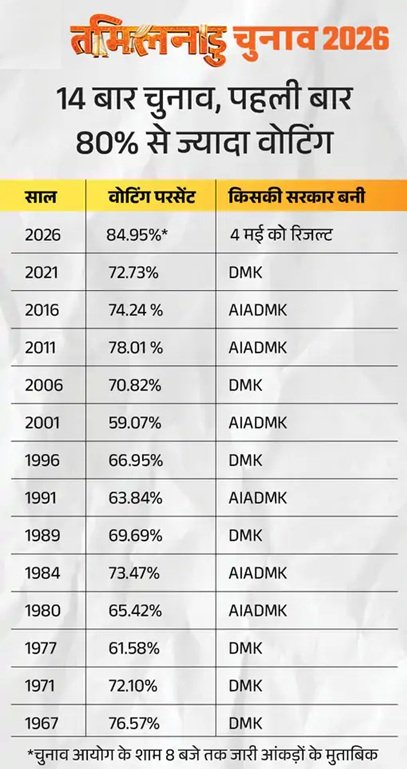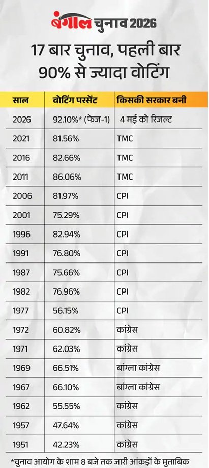 इससे पहले तमिलनाडु में सबसे ज्यादा मतदान 2011 में 78.29% था, जबकि बंगाल में 2011 में 84.72% मतदान दर्ज किया गया था। ममता ने वोटिंग के बाद कहा कि बंगाल की जनता ने SIR के खिलाफ बंपर वोटिंग की है। गृह मंत्री शाह ने कहा कि TMC का सूरज ढल चुका है।
