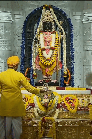 रामलला की सुबह की आरती की गई। रामलला ने सोने और रेशम के धागों से बने पीतांबर वस्त्र धारण किए हैं। यह पोशाक डिजाइनर मनीष तिवारी ने बनाई है।