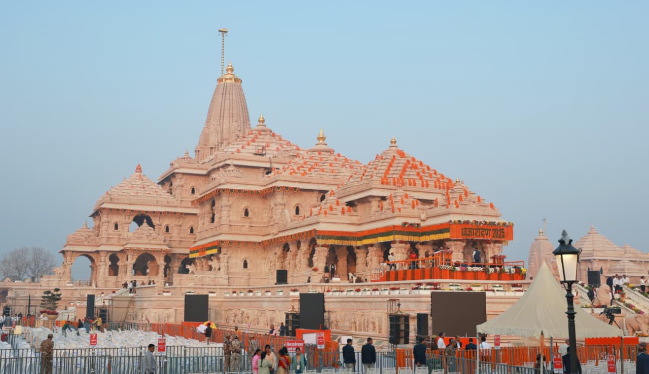 प्रधानमंत्री मोदी दोपहर साढ़े 12 बजे अभिजीत मुहूर्त में ध्वजा फहराएंगे। उनके बटन दबाते ही 2 किलो की केसरिया ध्वजा 161 फीट ऊंचे शिखर पर फहरने लगेगी। इसके साथ ही राम मंदिर को पूर्ण माना जाएगा। शहर को 1000 क्विंटल फूलों से सजाया गया है। अब आप तस्वीरों में देखिए राम नगरी अयोध्या की मनमोहक तस्वीरें…