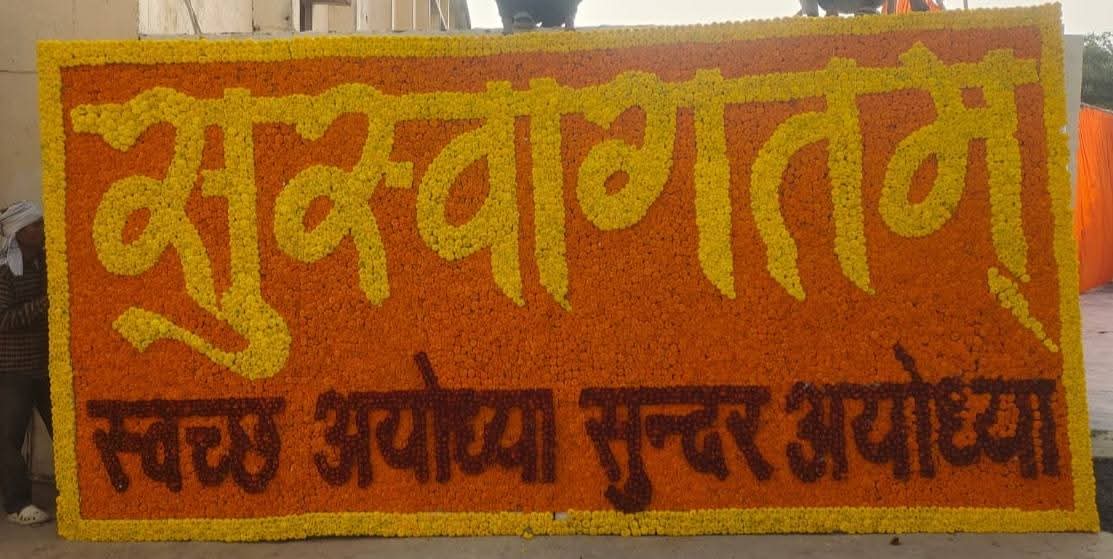 अयोध्या पहुंचे मेहमानों के स्वागत के लिए जगह-जगह इस तरह फूलों से स्लोगन लिखे हैं।