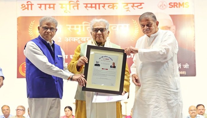 पीजीआई चंडीगढ़ के वरिष्ठ प्राध्यापक एवं पूर्व विभागाध्यक्ष सर्जरी प्रो. एसएम बोस को राम मूर्ति प्रतिभा अलंकरण से सम्मानित करते वन व पर्यावरण मंत्री डॉ. अरुण कुमार और एसआरएमएस ट्रस्ट के चेयरमैन देव मूर्ति।