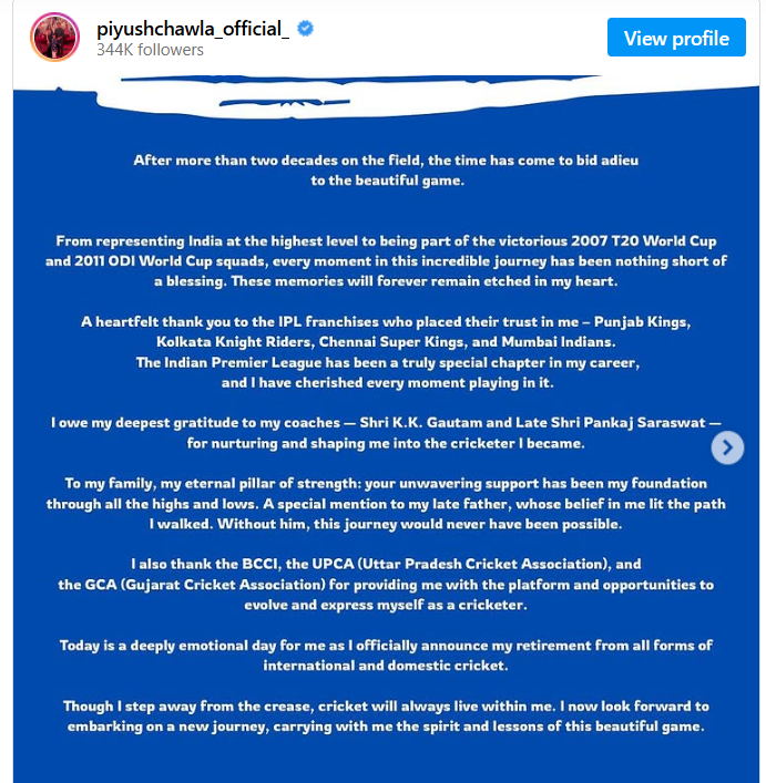 पियूष चावला ने रिटायरमेंट नोट में क्या लिखा