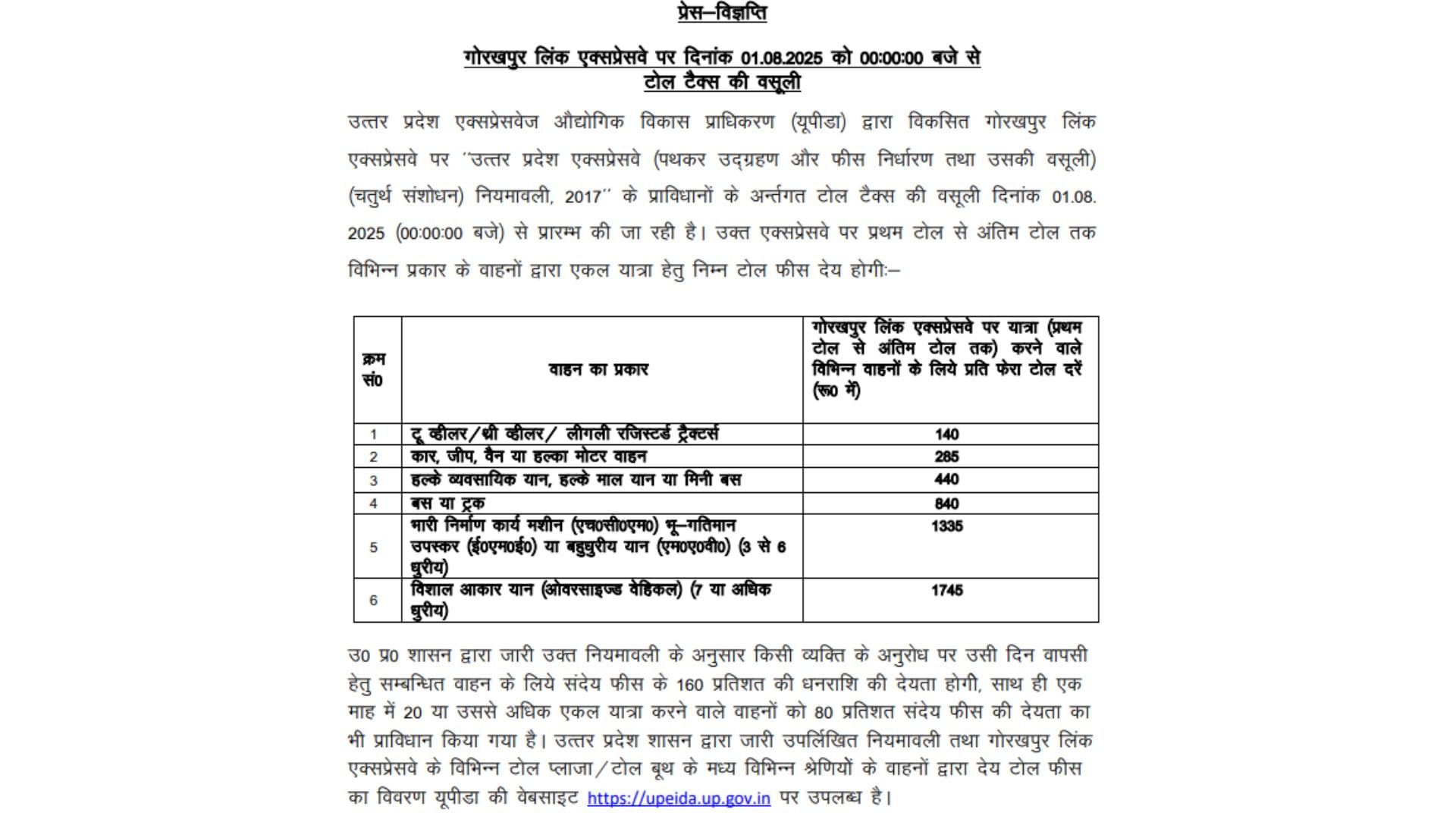 UP News: गोरखपुर लिंक एक्सप्रेसवे पर एक अगस्त से टोल टैक्स की वसूली शुरू हो जाएगी। इसके लिए दरों की सूची जारी कर दी गई है। एक्सप्रेस वे पर दोपहिया वाहनों पर भी प्रति फेरा 140 रुपये की दर से टैक्स लिया जाएगा। जारी की गई सूची के अनुसार गोरखपुर लिंक एक्सप्रेसवे पर टू व्हीलर/थ्री व्हीलर/लीगली रजिस्टर्ड ट्रैक्टर्स पर प्रति फेरा 140 रुपये की वसूली होगी। वहीं, कार, जीप, वैन या हल्के मोटर वाहन पर प्रति फेरा 285 रुपये चार्ज किया जाएगा।