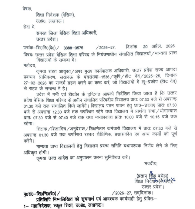 वहीं शिक्षक, शिक्षामित्र, अनुदेशक, शिक्षणेत्तर कर्मचारी विद्यालय में सुबह 7.30 से दोपहर 1.30 बजे तक रहेंगे। इस दौरान वे शैक्षणिक, प्रशासकीय व अन्य कार्यों को पूरा करेंगे। निदेशक ने कहा है कि मान्यता प्राप्त विद्यालयों के लिए प्रबंध समिति आवश्यक निर्णय लेने को अधिकृत होगी। बता दें कि प्रदेश में तेजी से बढ़ रही गर्मी को देखते हुए शिक्षक संगठन लगातार विद्यालयों का समय बदलने की मांग कर रहे थे। वहीं कुछ जिलों में विद्यालय का समय बदला भी था।